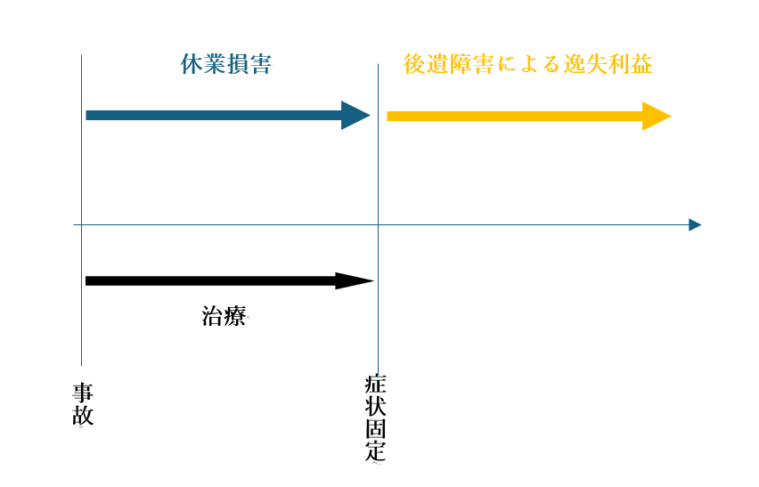 1 休業損害とは、交通事故による負傷の治療で、作業又は不十分な就労しかできなくなった場合、治療期間中に得たはずの収入を失ったことによる損害です(後遺障害逸失利益との違いについては、下図を参照ください)。