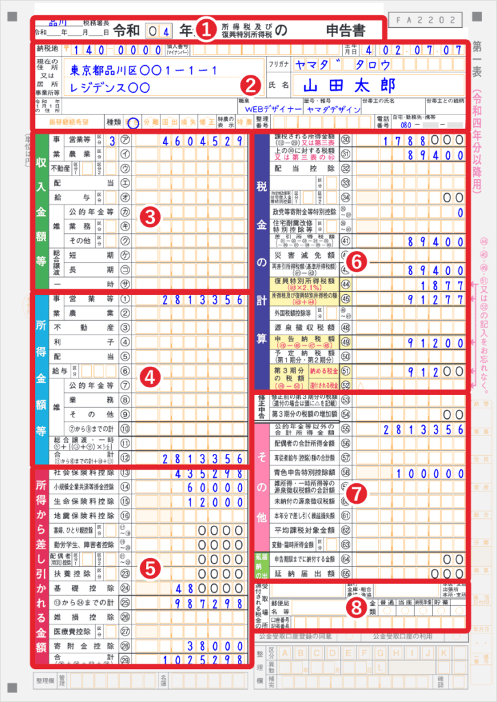 1 事業所得者の基礎収入の算定方法は、基本的に後遺障害逸失利益の場合における基礎収入の算定方法と同様です。簡単に説明すると、事故前年の確定申告書の所得金額(下図の④)を基に算定されます。