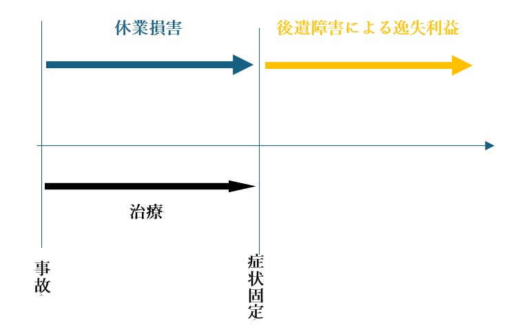 1 休業損害は、症状固定(治療をしてもその効果が期待できない状態で、かつ、残存する症状が自然的経過によって到達する最終の状態)時までに発生した現実の損害をカバーするものです。他方で、症状固定後の将来に向かって発生する損害については、専ら後遺障害逸失利益(以下、「逸失利益」といいます。)によってカバーされます(下図参照)。