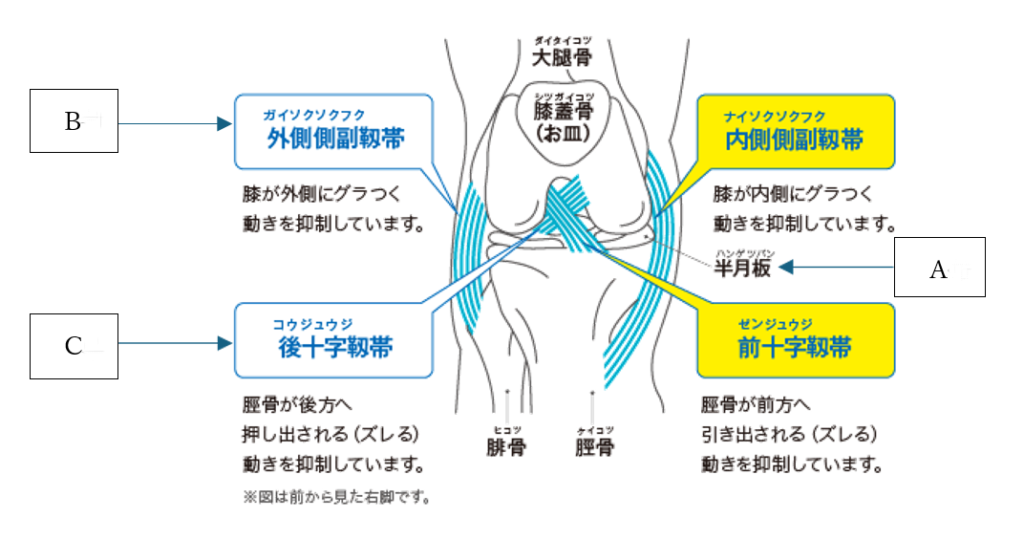 ⑷ 損傷や断裂が生じた膝の部位について、以下の図を使って簡単に説明します。右膝内側半月板損傷・右膝外側側副靭帯損傷(1回目の診断)は、下図A・Bに損傷がある状態です。右膝後十字靭帯断裂・外側側副靭帯断裂(2回目の診断)は、下図B・Cが断裂した状態です。